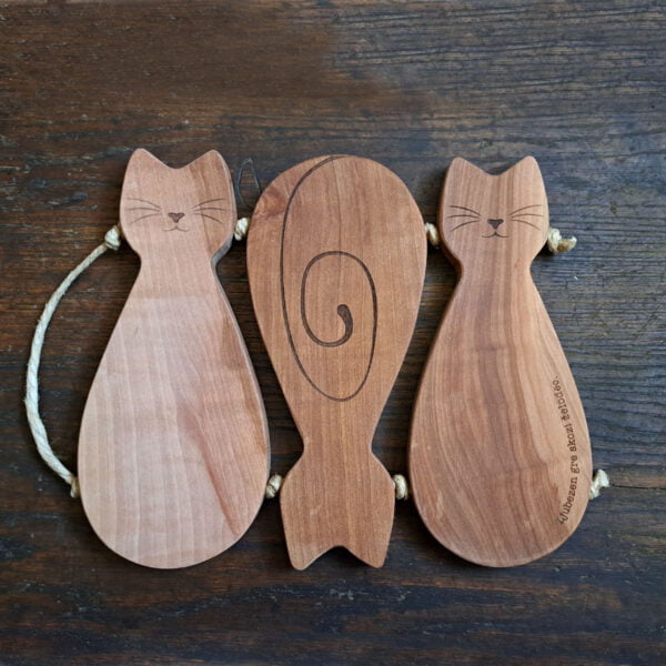 Podstavek za vročo posodo je sestavljen iz treh delov. Stilizirana podoba mačke, je v celoto povezana z naravno vrvico – motvozom. Podstavek je premazan z naravnimi olji, ki so primerni za stik z živili.
