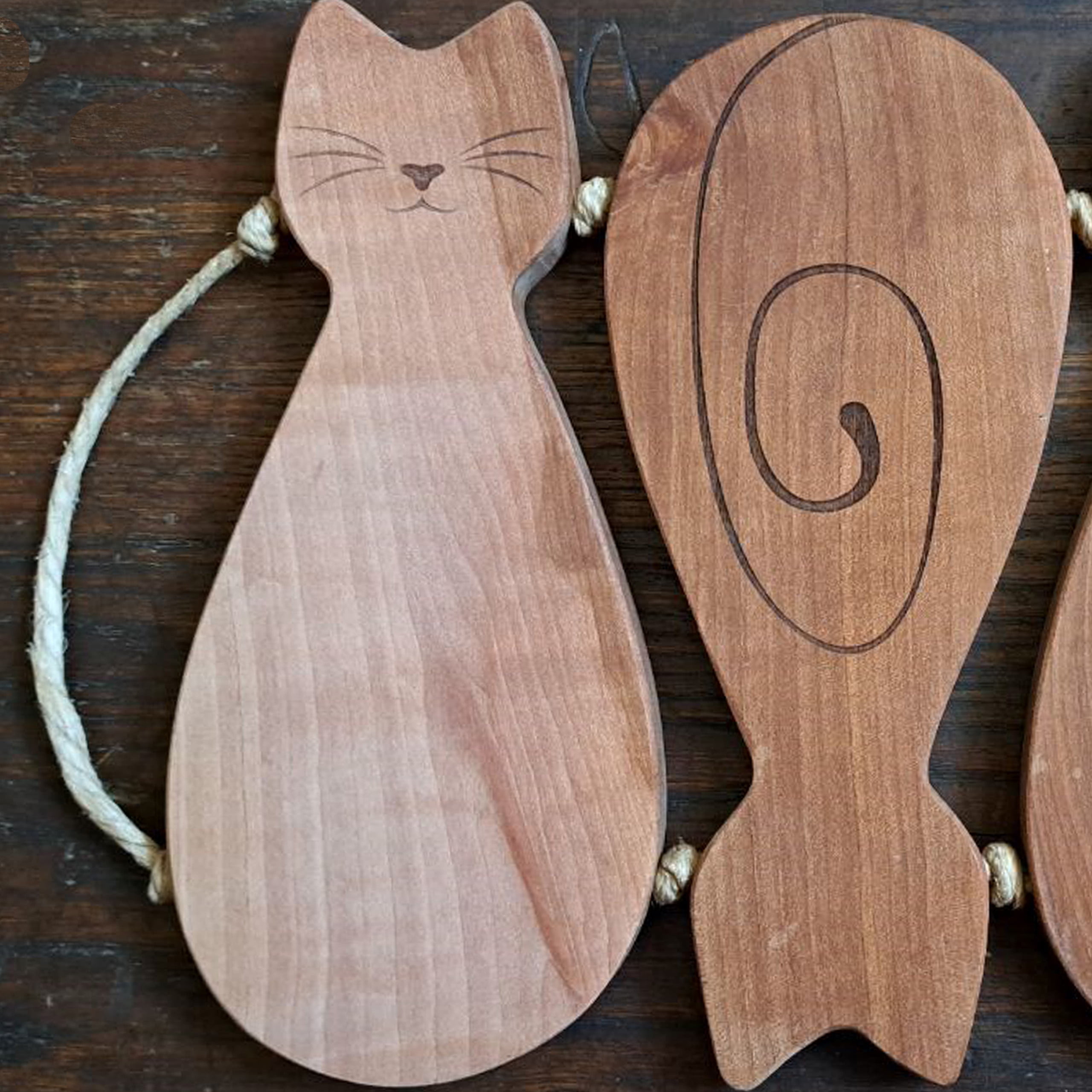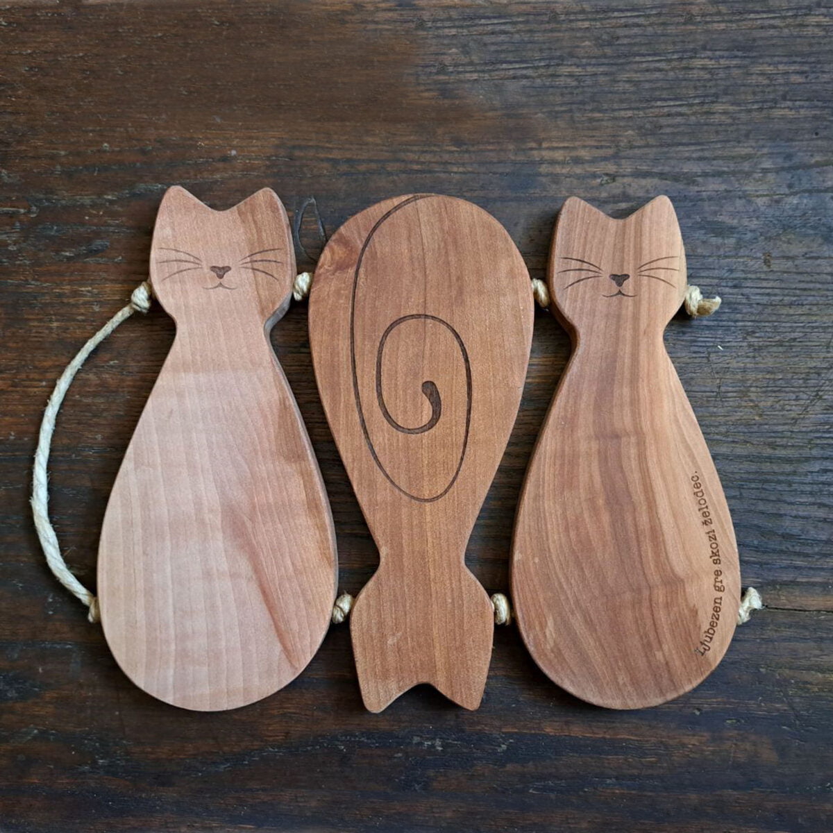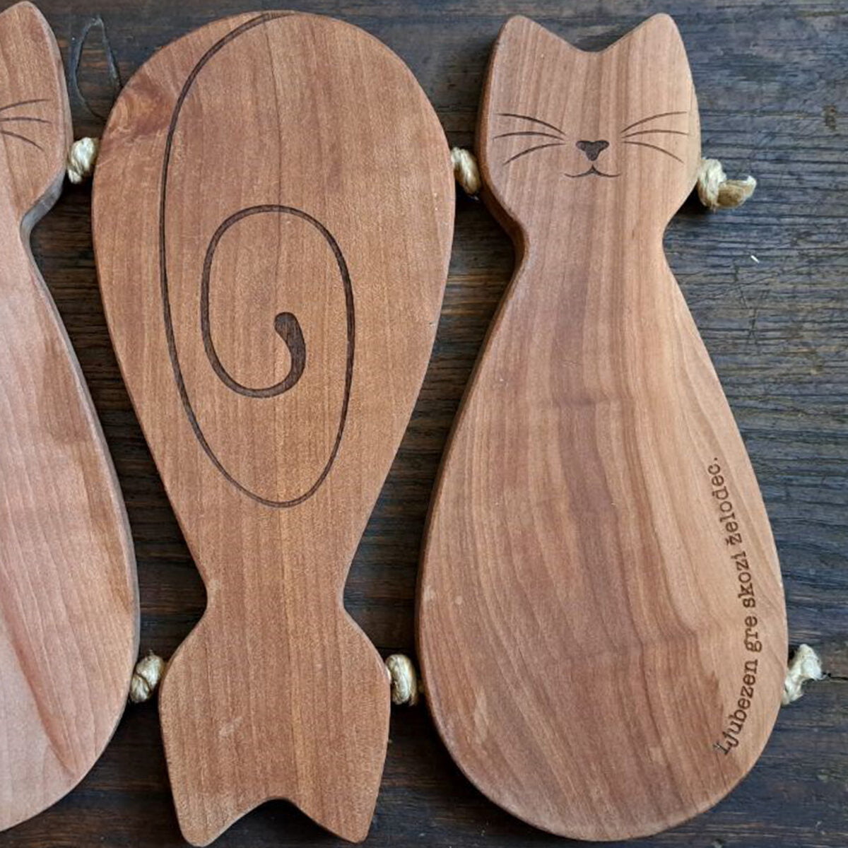 Podstavek za vročo posodo je sestavljen iz treh delov. Stilizirana podoba mačke, je v celoto povezana z naravno vrvico – motvozom. Podstavek je premazan z naravnimi olji, ki so primerni za stik z živili.