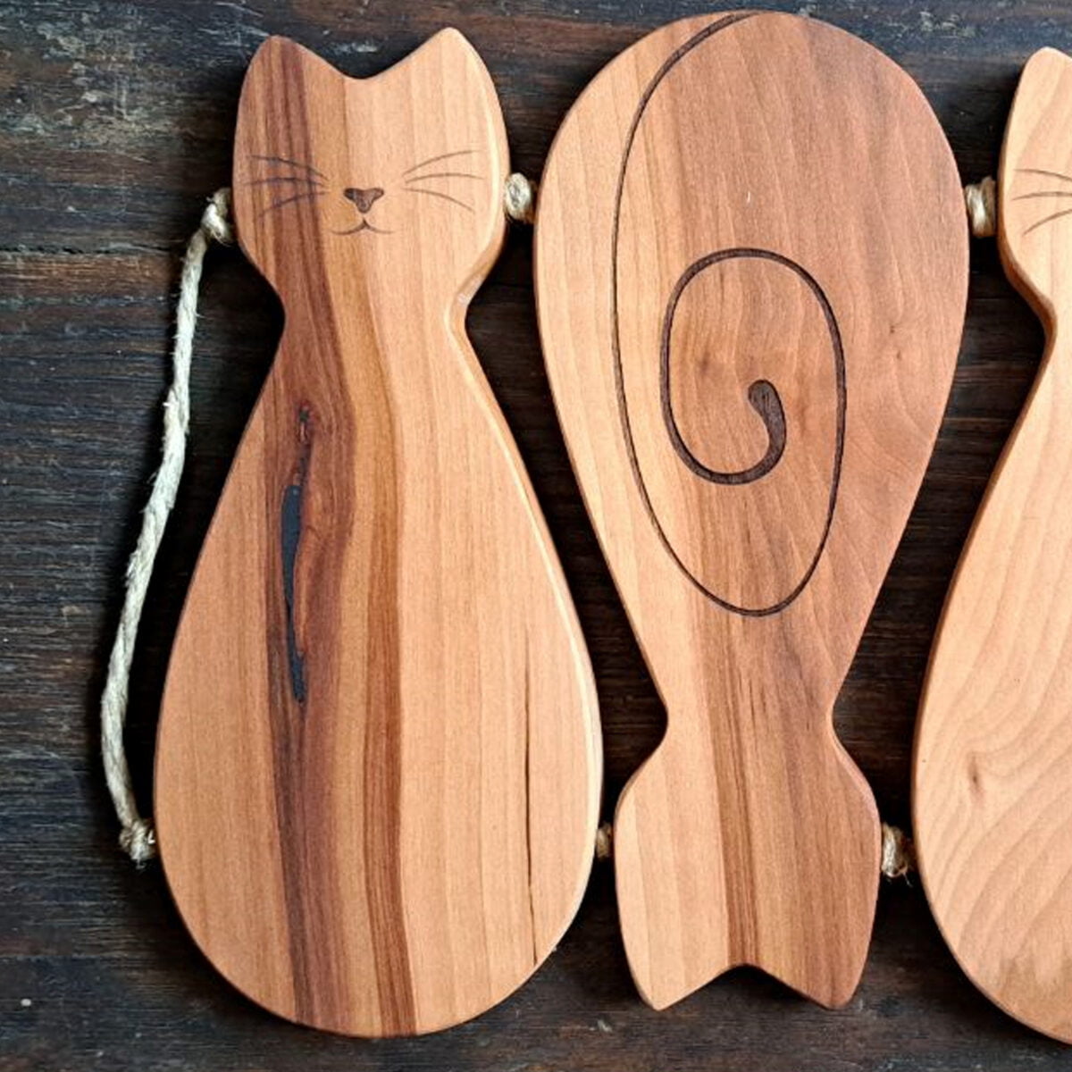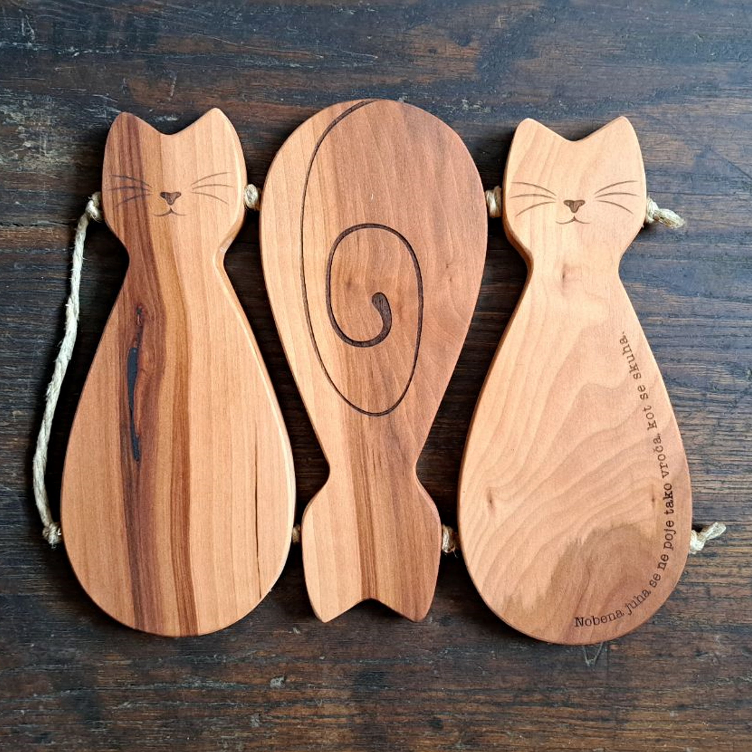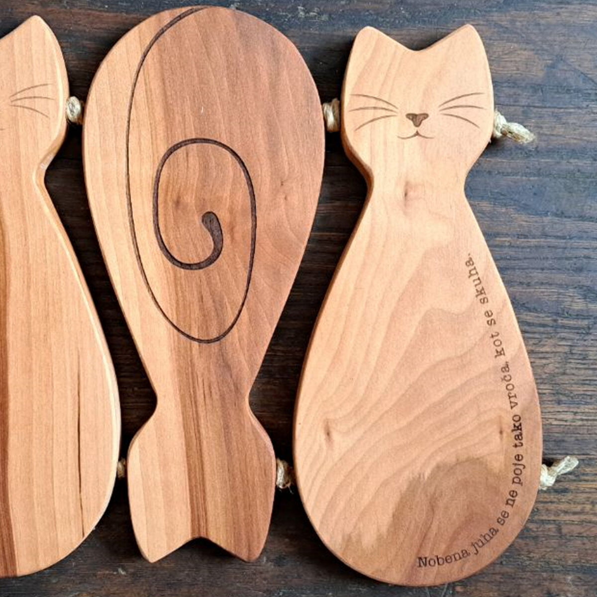 Podstavek za vročo posodo je sestavljen iz treh delov. Stilizirana podoba mačke, je v celoto povezana z naravno vrvico – motvozom. Podstavek je premazan z naravnimi olji, ki so primerni za stik z živili.