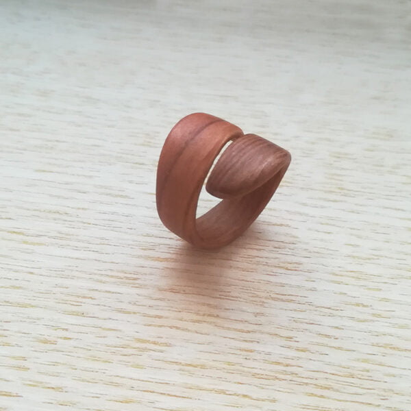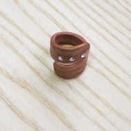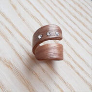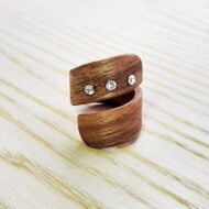 Ročno izdelan prstan, narejen z upogibanjem in lepljenjem tankih slojev lesa – furnirja. Ima edinstveno spiralno obliko in vdelane 3 swarovski kristale v beli barvi. Pri izdelavi prstana so uporabljena lepila, ki se porabljajo pri izdelavi pohištva.