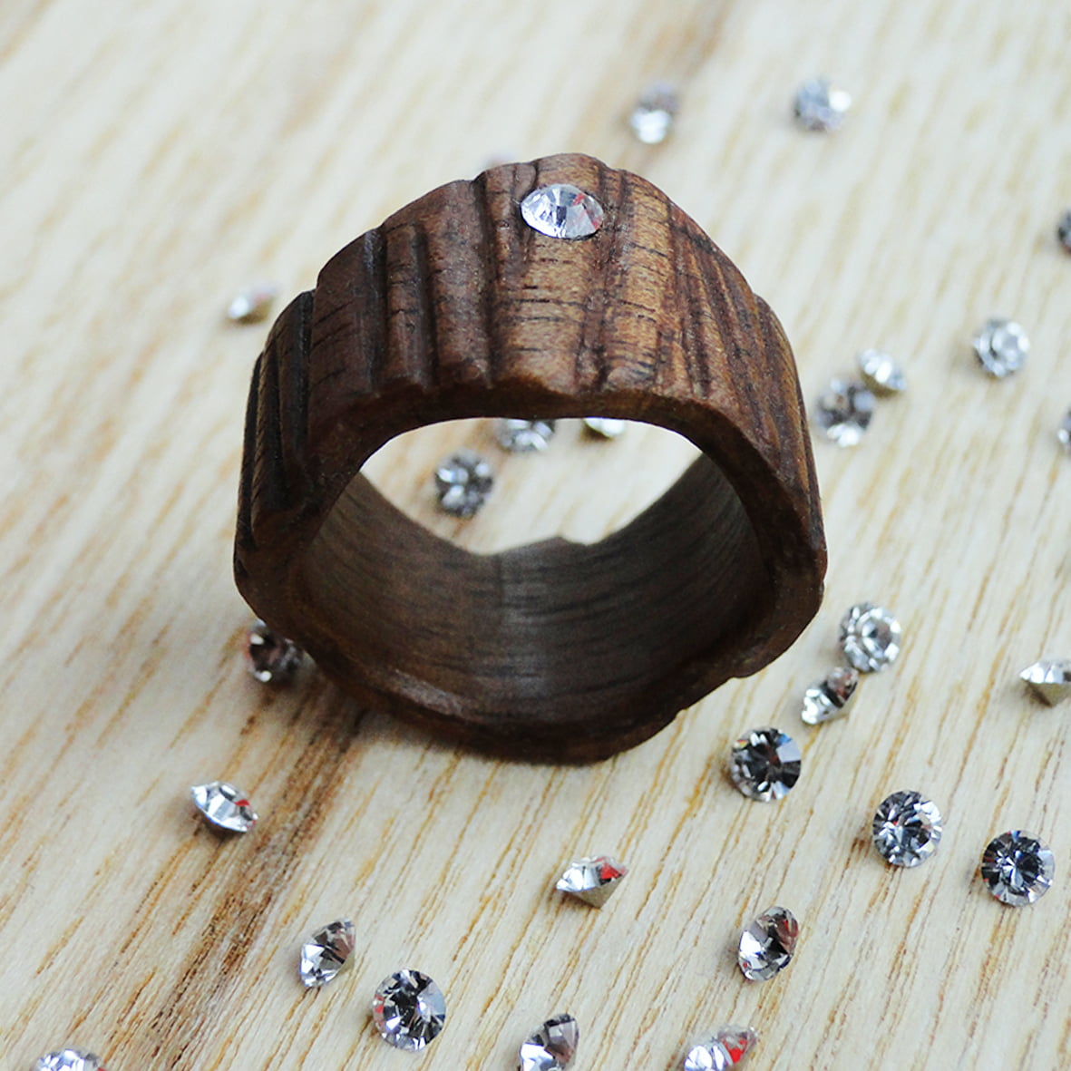 Prstan s svojim nepravilnim robom in utori na površini spominja na deblo drevesa, dodan mu je swarovski kristal.