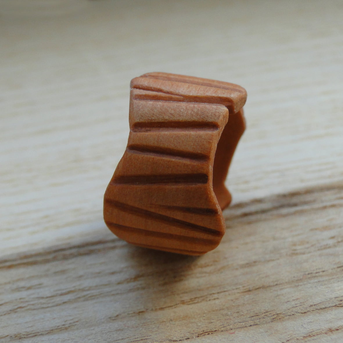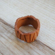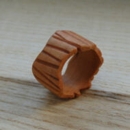Ročno izdelan prstan, narejen z upogibanjem in lepljenjem tankih slojev lesa – furnirja. V površino prstana so narejeni utori, kar daje prstanu poseben videz. Pri izdelavi prstana so uporabljena lepila, ki se porabljajo pri izdelavi pohištva.