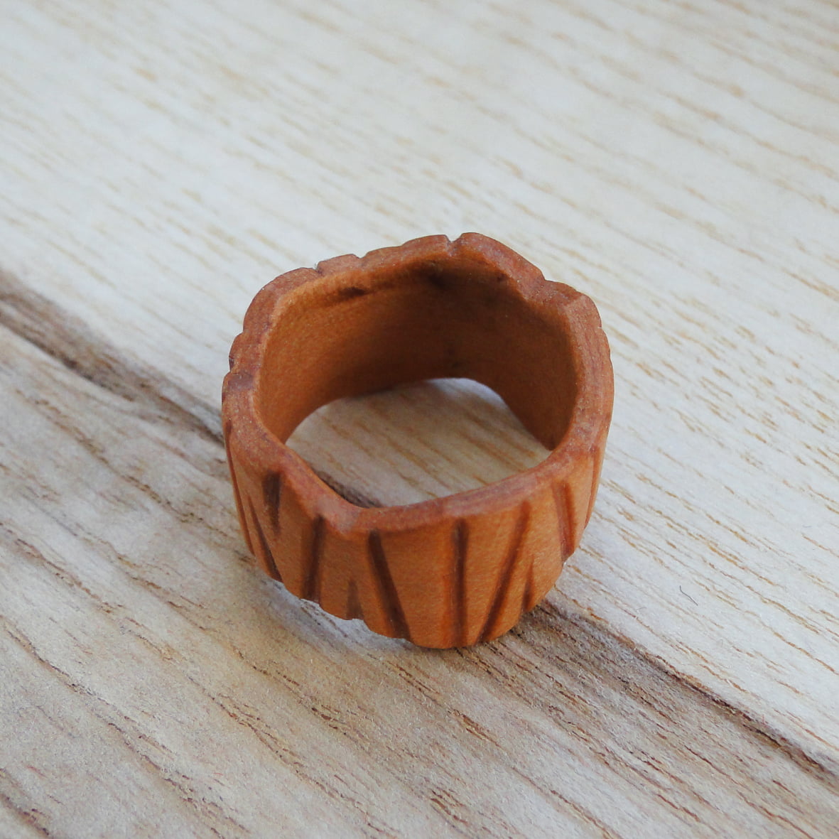 Prstan s svojim nepravilnim robom in utori na površini spominja na deblo drevesa.